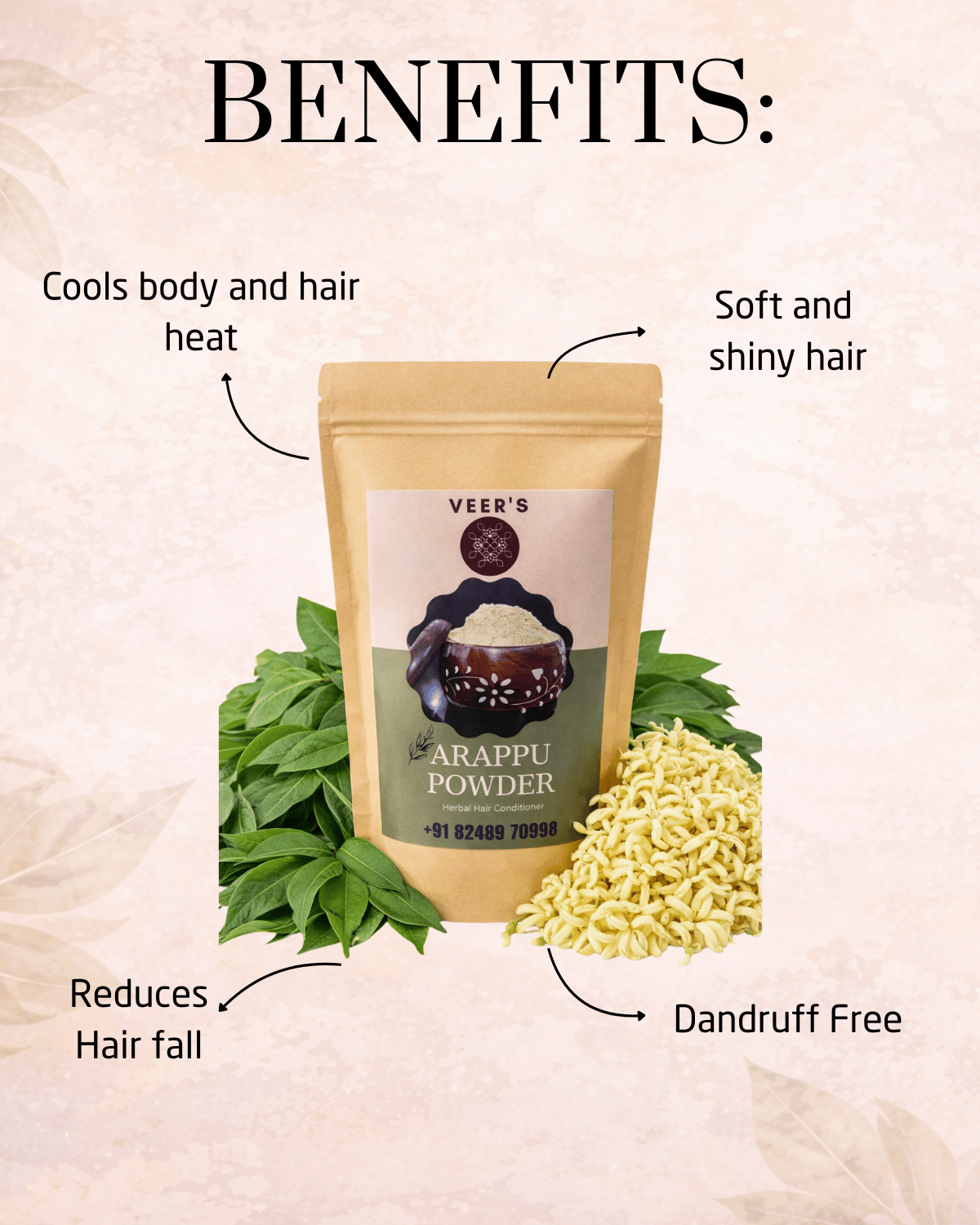 This pack includes Shampoo Powder (100g) for gentle hair cleansing, Hair Conditioner Powder (100g) to soften and strengthen hair, Hair Oil (100ml) to nourish the scalp and promote healthy hair growth, and Body Scrub (100g) to exfoliate and refresh the skin. Each product is carefully prepared using natural herbs known for their beneficial properties.
